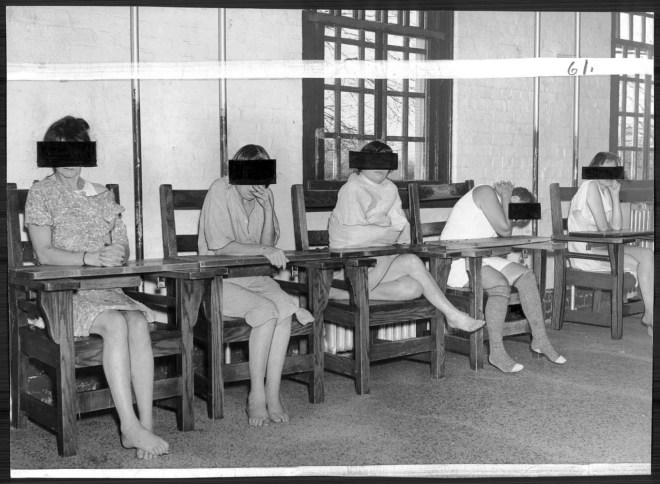 LOCKED IN THEIR CHAIRS Because there are not enough attendants to keep an eye on them, these women at Springfield state hospital are confined in locked chairs day after day. They get no treatment at all. Photo by Robert F. Kniesche